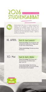 | 30.05. | Studiensabbat mit Prof. Dr. Rolf Poehler |